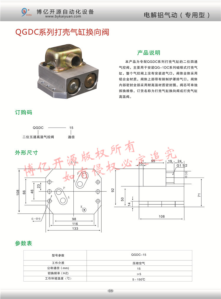 【產(chǎn)品特點】:該閥為電解鋁打殼氣缸專用換向控制閥,單進(jìn)氣控制,可直接連接氣缸后端蓋