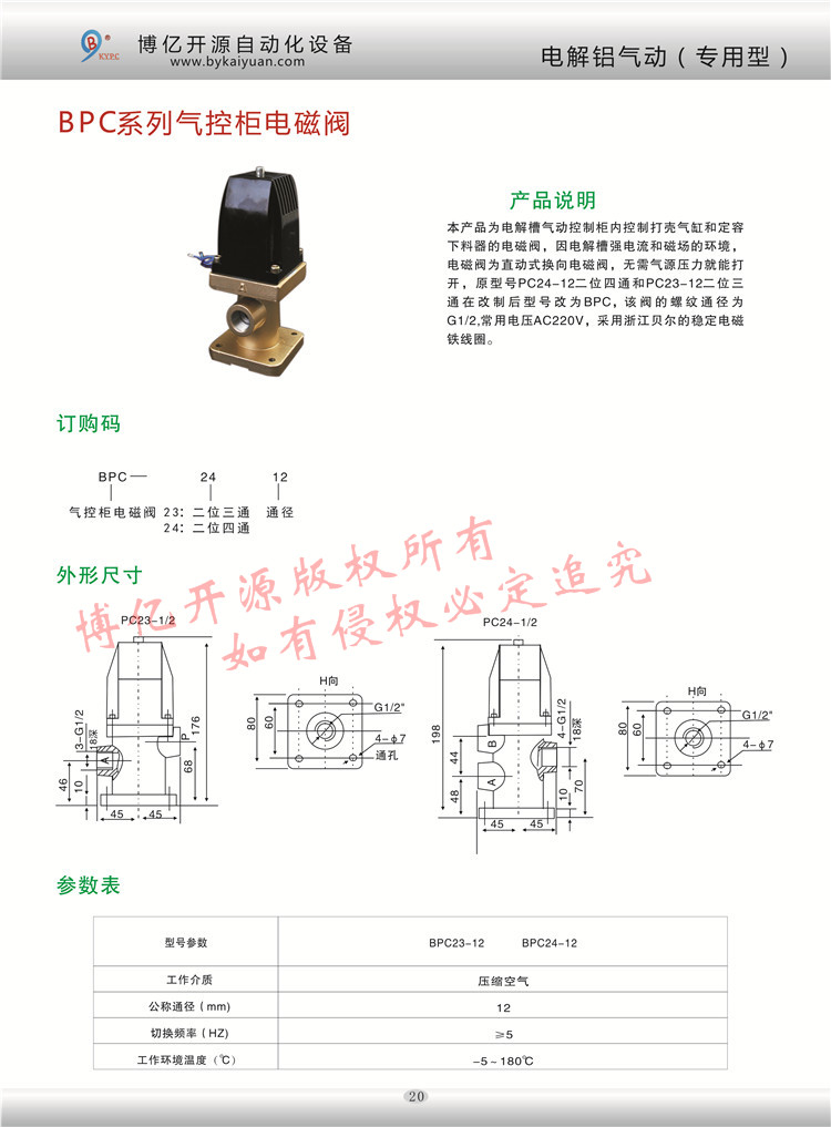 型號BPC24-12二位三通電磁閥和BPC24-12二位四通電磁閥是電解鋁行業(yè)電解槽控制柜內(nèi)的專用電磁閥,主要用于控制打殼氣缸和定容下料器,更多的技術(shù)咨詢請聯(lián)系本公司技術(shù)部:0371-85612788。