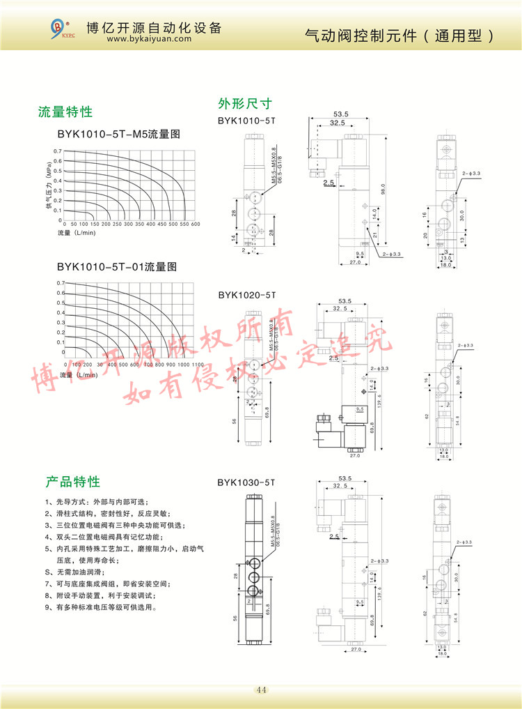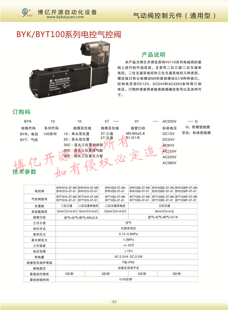 BYK/BYT100系列電控氣控型號有M5接口和一分接口的二位三通、二位五通、三位五通單電控,雙電控的各種電壓控制,更多的技術(shù)咨詢請聯(lián)系本公司技術(shù)部:0371-85612788。
