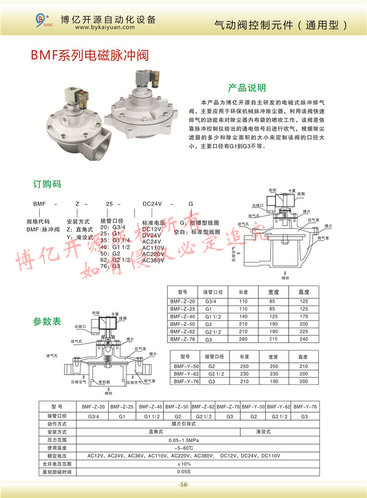 產(chǎn)品描述 【產(chǎn)品名稱】:BMF系列電磁脈沖閥 【產(chǎn)品型號】:直角式、淹沒式 【產(chǎn)品介紹】:本產(chǎn)品為博億開源自主研發(fā)的電磁式脈沖排氣閥,主要應(yīng)用于環(huán)保機(jī)械脈沖除塵器,利用該閥快速排氣的功能來對除塵器內(nèi)布袋的噴...