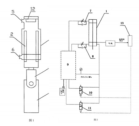 構(gòu)成:缸體1和裝在缸體1中的活塞軸2,缸體1的直徑為180mm;活塞軸2連接接頭3,接頭3連接打殼錘頭4;在缸體1的前缸蓋內(nèi)壁上裝有壓力傳感器,壓力傳感器通過導(dǎo)線與槽控機(jī)13相連;在缸體1的上部設(shè)有上進(jìn)氣口5、下部設(shè)有下進(jìn)氣口6,上進(jìn)氣口5連接上進(jìn)氣閥7,下進(jìn)氣口6連接下進(jìn)氣閥8,上進(jìn)氣閥7和下進(jìn)氣閥8連接控制閥組9;控制閥組9與主控閥10和風(fēng)壓切換閥11相連接,主控閥10、風(fēng)壓切換閥11通過導(dǎo)線連接槽控機(jī)13。在缸體1的頂部裝有永磁材料制作而成的磁控制鎖12,用于在系統(tǒng)停風(fēng)時對活塞軸2進(jìn)行自鎖,防止打殼錘頭4下滑。在操控機(jī)13中設(shè)有一個紅色警示燈和一個綠色警示燈,用于警示打殼過程中的開始和結(jié)束。