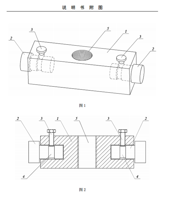 實施例一:參見圖1和圖2,該夾緊接頭用于快速鏈接電解槽上母線與導桿組,包括方套1和軸頭2,在方套1兩端分別設置有軸孔,兩軸頭2分別匹配套裝在兩個軸孔內,軸頭2的中部設置有環(huán)形凹槽4,在方套1側面設置有用于鎖緊軸頭的鎖定螺釘3,所述鎖緊螺釘3匹配插入該環(huán)形凹槽4內。方套1的中心設置有用于固定的螺紋孔5。